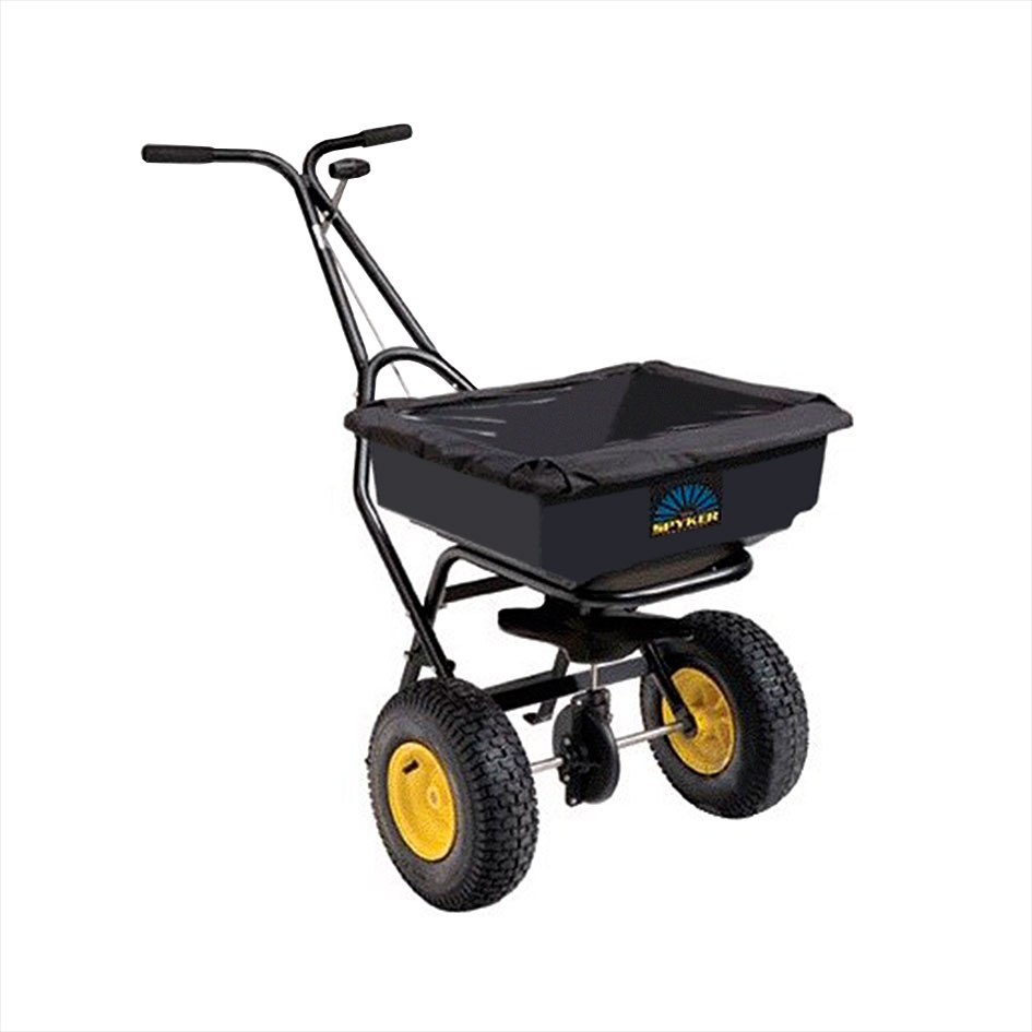 Abonadora manual con un diámetro de abonado de 1´22 a 3´65 metros. La tolva es de polipropileno y su capacidad es de 36'30 kg.. Las ruedas de la abonadora son neumáticas.
