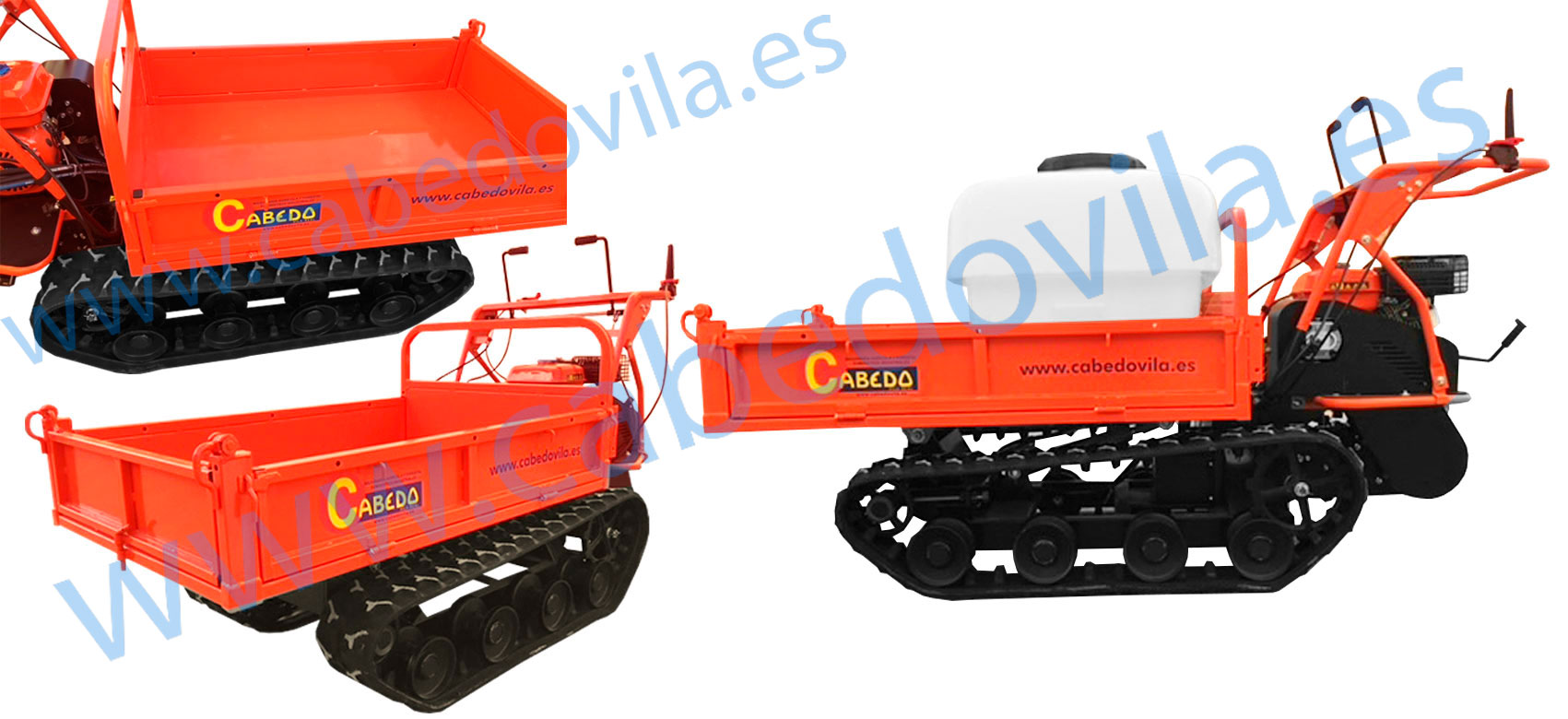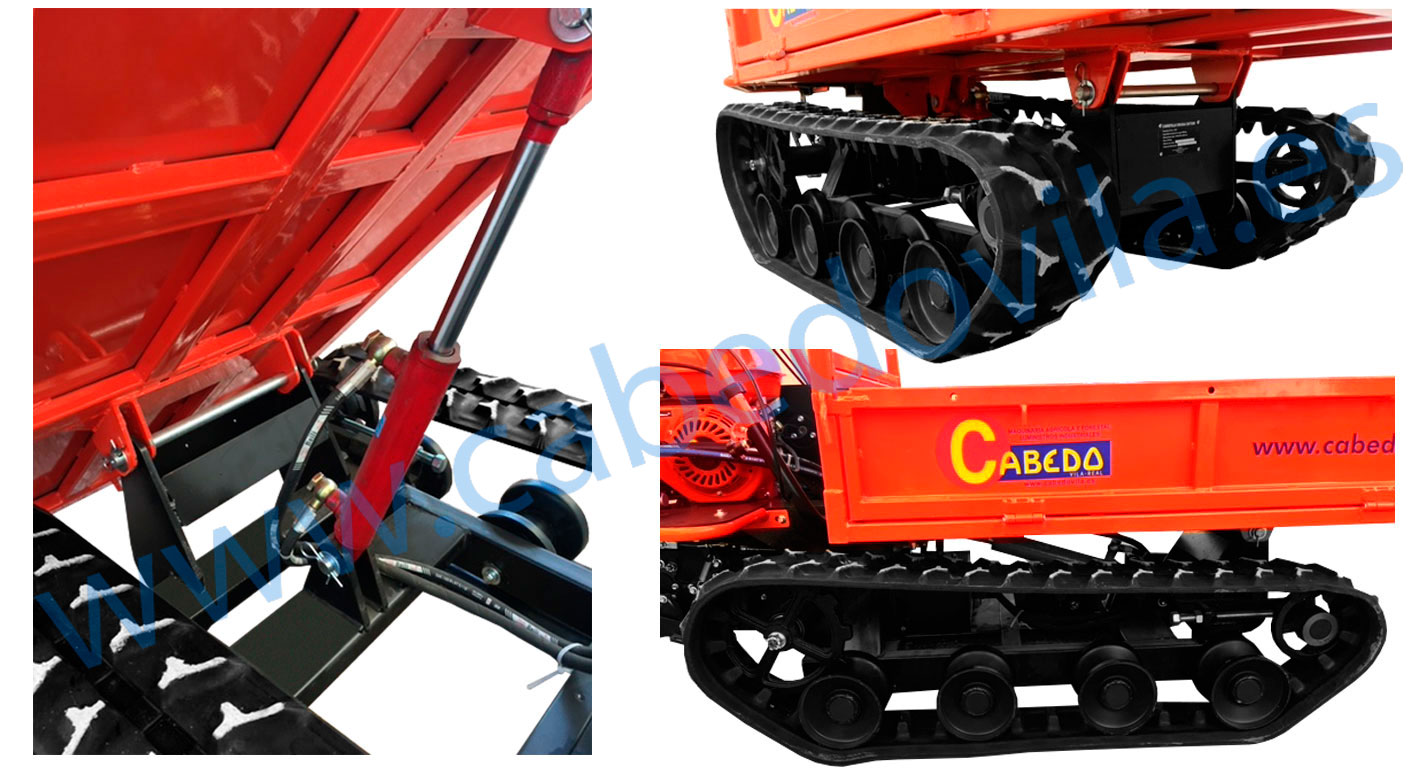 Debemos destacar que la calidad que ofrece la carretilla todo terreno es uno de los criterios que el diseñador y constructor de la misma ha seguido según estrictos estándares del sector. Con una capacidad de carga de 500 kg., alta fiabilidad y larga duración en cuanto a su funcionamiento, que, junto con las anchas orugas, permite la adherencia al suelo lo cual garantiza seguridad para el trabajador en pendientes empinadas. Provista de plataforma y barandillas laterales que son extensibles, facilitan su adecuación según el tipo carga, además, cuenta con una bomba hidráulica que facilita la descarga. Otros: 4 velocidades, 3 adelante y 1 atrás.